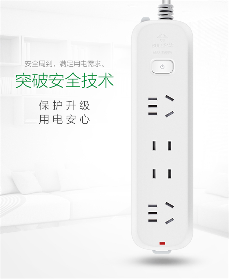 插孔全部新增防触电保护门,避免手指或细小物件插入触电 插套铜带一体设计,强扭不变形,耐插拔,使用寿命长 专为大插头设计的大间距插孔,多电器同时使用插拔方便 上下双挂钩,方便任何场景