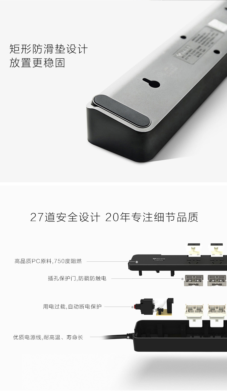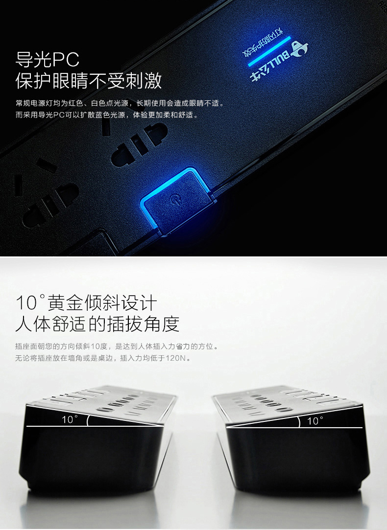 超功率保护,当负载功率总和超出额定功率,弹钮即刻自动弹出,切断电源 采用北美、欧洲先进的热流道工艺一次性注塑成型,一体式设计尽显时尚 10°黄金倾斜设计,人体舒适的插拔角度 无空行程式开关,带来琴键般的按压体验 电线伸长率高达198%,足够柔韧,不易断集成抗电涌电路可不间断吸收电源中高、中、低不同强度的电涌 超功率保护,当负载功率总和超出额定功率,弹钮即刻自动弹出,切断电源 采用北美、欧洲先进的热流道工艺一次性注塑成型,一体式设计尽显时尚 无空行程式开关,带来琴键般的按压体验