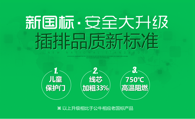 集成抗电涌电路可不间断吸收电源中高、中、低不同强度的电涌 超功率保护,当负载功率总和超出额定功率,弹钮即刻自动弹出,切断电源 采用北美、欧洲先进的热流道工艺一次性注塑成型,一体式设计尽显时尚 10°黄金倾斜设计,人体舒适的插拔角度 电线伸长率高达198%,足够柔韧,不易断 矩形防滑垫设计,放置更稳固