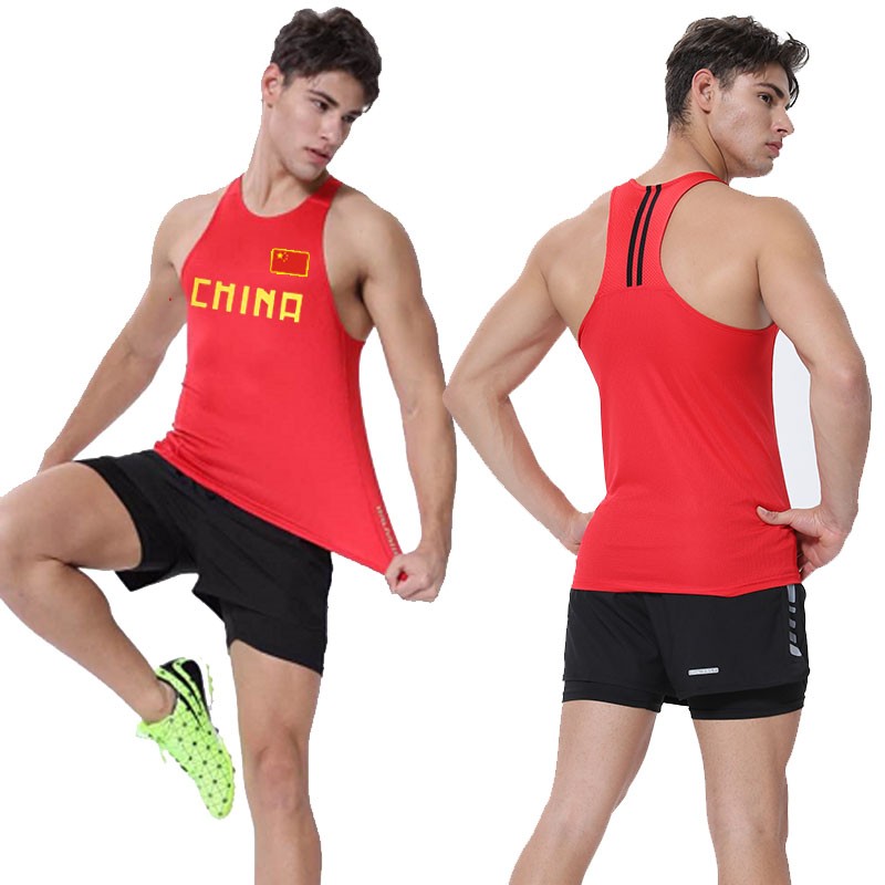 中国队马拉松跑步套装运动套装窄肩背心健身套装男跑步无袖速干T恤短裤国家队田径服套装运动服定制印字223蓝色国旗版上衣4XL90公斤以上