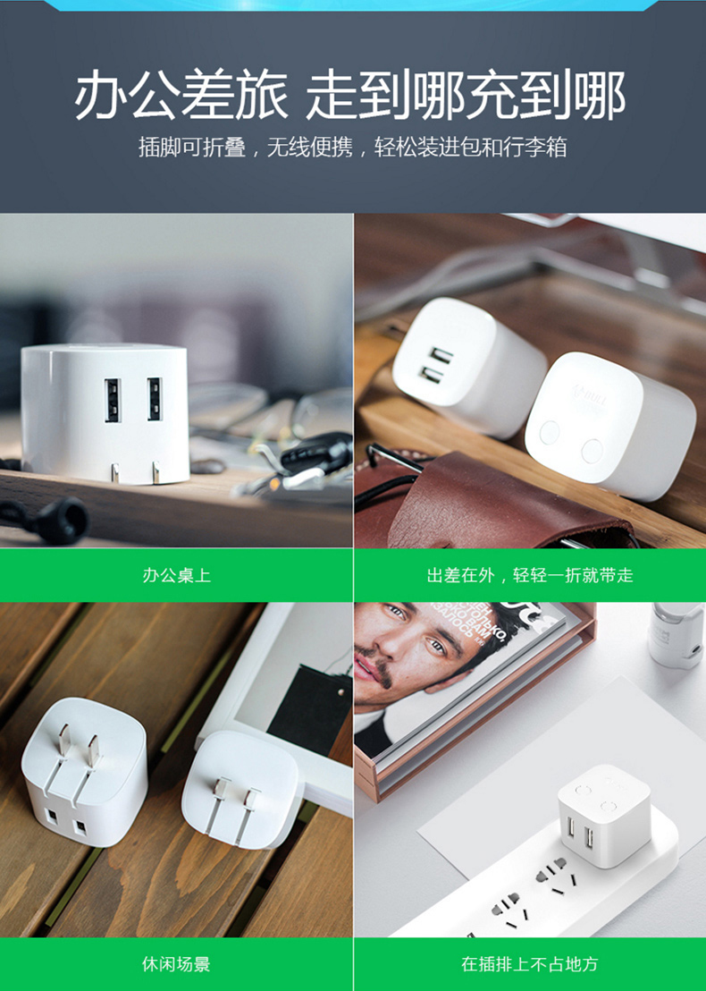 智能识别电子设备,根据充电时的电流情况判断充电时间,充满自动断电B双接口,每个接口都有独立控制按键、切换通断电状态插脚可折叠,无线便携,轻松装进包和行李箱